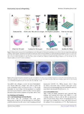 layer of the 3D model was printed. (D) The outer layer of the 3D model was completely crosslinked by being incubated at 37°C for 30 min. (E) The inner