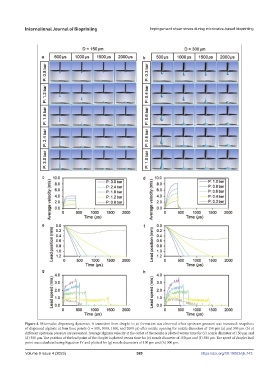 different upstream pressure are presented. Average alginate velocity at the outlet of the nozzle is plotted versus time for (c) nozzle diameter of 150 µm and