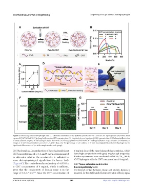 of tissue adhesive property of the hydrogel treated with NHS. (E) Photographs of PVA/TA/PAA/CNT hydrogel adhesion on porcine skin. (F) Fluorescent