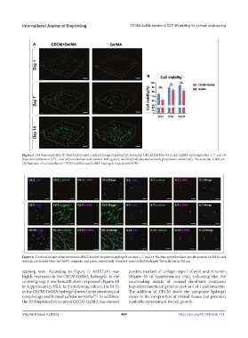 Figure 5. (A) Representative 3D live/dead stained confocal image of printed hCFs-loaded CECM-GelMA (CG) and GelMA hydrogels after 1, 7, and 14