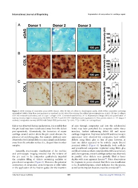 staining intensity (right) to characterize (A) sGAG, (B) COL II, and (C) COL I distribution and organization for three porcine donors. n = 81 images, 9