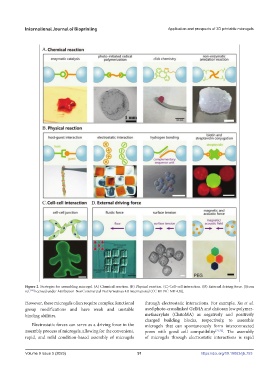 Figure 2. Strategies for assembling microgel. (A) Chemical reaction. (B) Physical reaction. (C) Cell–cell interaction. (D) External driving force. [(from