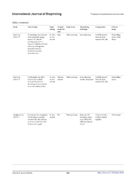 Apelgren et al. To evaluate if an integrated In vivo Rat Direct printing Extrusion 3D Cells in bioink + Other shape Bioink Human bone After printing, Histopathology • 3D-bioprinted cartilage that has been allowed • Since rodents heal by