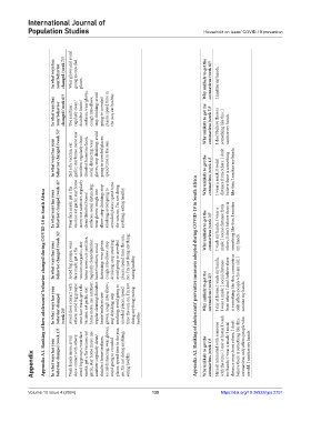 Appendix In what ways has your behavior changed (week 1)? Wash hands more; avoid close contact with others; avoid big groups; wear face masks; get a flu vaccine; eat garlic; stay home more; use sanitizer; regularly clean/ disinfect home/surfaces; social distancing; wear gloves; avoid going to crowded places; spend time in the sun; no, I’m not doing anything; eating healthy. Why unlikely to get the coronavirus (week 1)? Haven’t inter