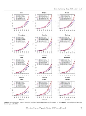 Figure 2. Age-trajectories of observed death rates in China's 2000 census for selected provinces by sex in comparison with the Kannisto model and