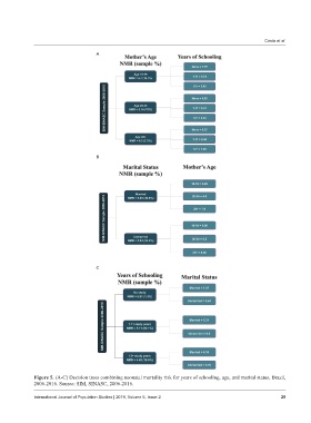 Figure 5. (A-C) Decision trees combining neonatal mortality risk for years of schooling, age, and marital status, Brazil,