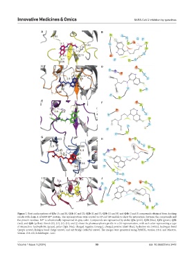 (red), and Q4b (yellow). Panels (B), (D), (F), (H), and (J) show the pharmacophoric profile in a 2D representation, with each color representing a type