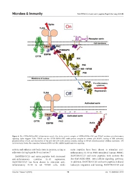 signaling. Spike triggers TLR4, TIRAP, and the CFTR+EBP50+PKC multi-protein complex to activate p38 MAPK, leading to IKK activation,