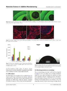 Figure 11. Confocal images of human dermal fibroblasts spreading on the printed calcium carbonate-photoinitiated construct on days 1, 3, and 7, from