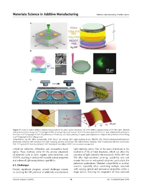 Figure 15. Cases of various additive manufacturing methods for active optical structures. (A) DIW additive manufacturing of 3D QD-LEDs. Adapted