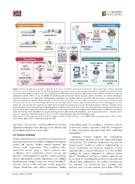 provide an overview of their structure. The top left panel illustrates regenerative medicine, where tendon organoids are transplanted into injured tendons